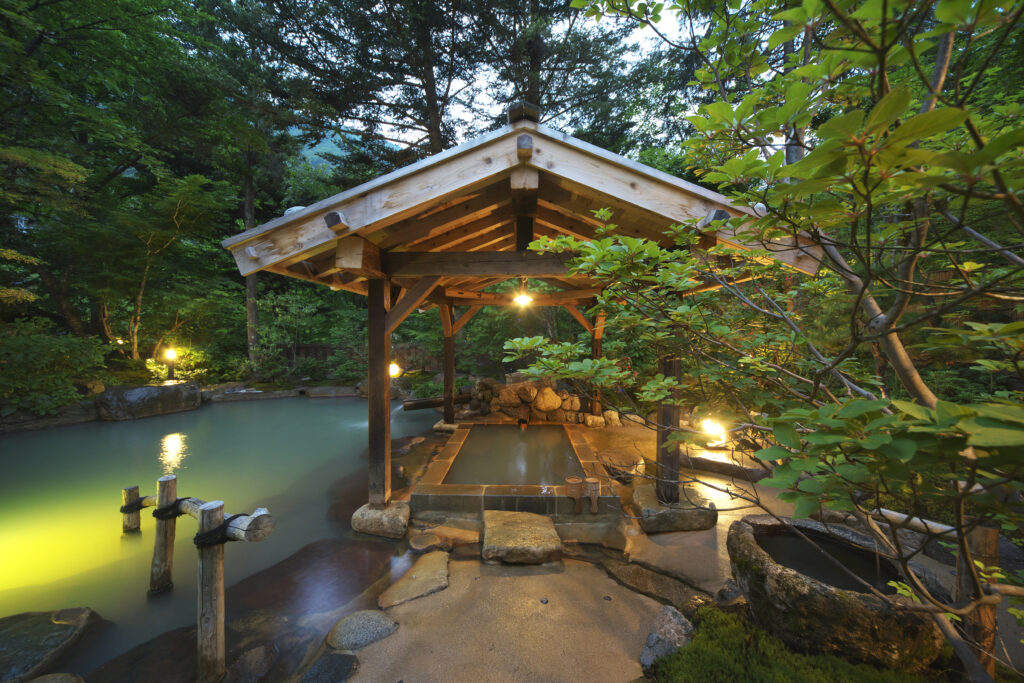 The hot spring baths, which use water directly from the source, include four private open-air baths and a men's bath.