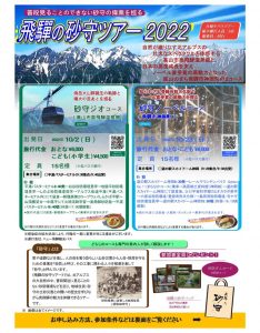 普段見ることのできない砂守の偉業を巡る、その名も「飛騨の砂守ツアー」を本年も開催いたします。自然が織りなす北アルプスの壮大なスペクタクルを体感する奥飛騨温泉郷と、日本の高度成長を支えノーベル賞受賞の原動力となった鉱山のまち飛驒市神岡町の2コースでの開催となります。