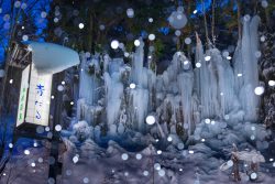 Within the mountains of the Fukuji Onsen area stands the “Fukuji Wall” rock face. As water seeps from the rock face it freezes into columns of blue ice, known as Aodaru.