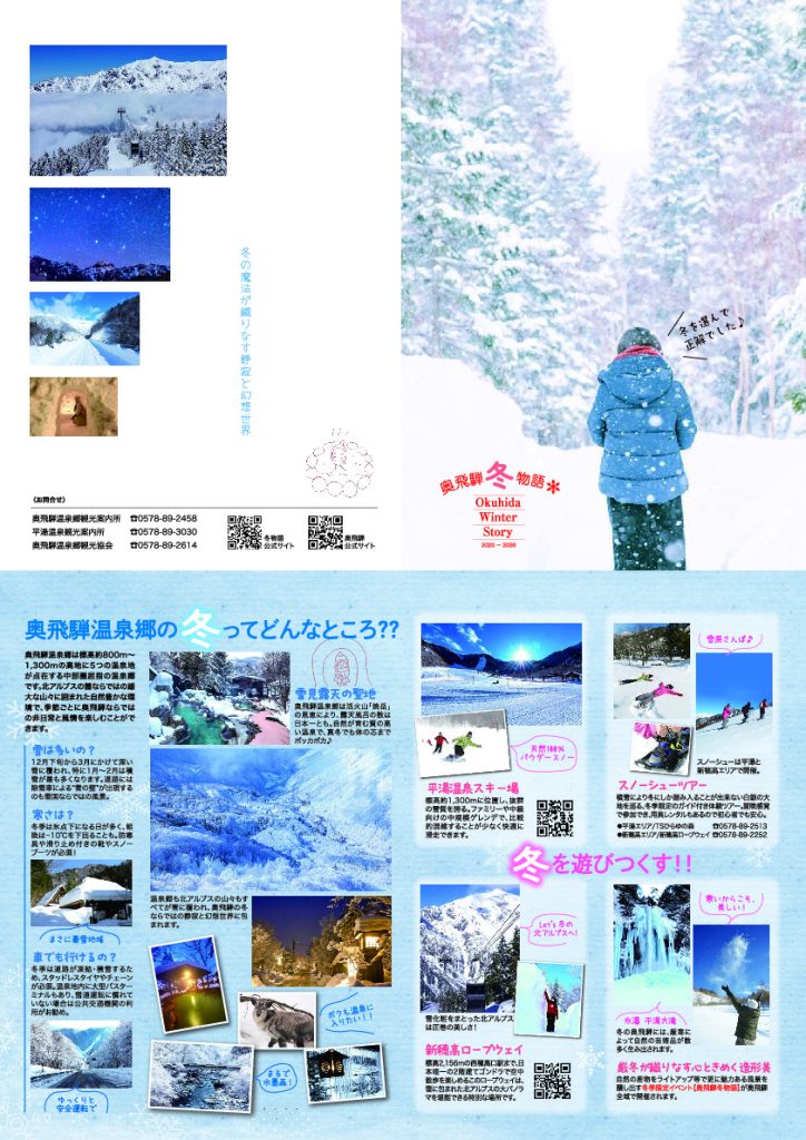 デジタルパンフレット 奥飛騨温泉郷総合パンフレット ドライブマップドライブマップ 奥飛騨冬物語パンフレット2025-2026 奥飛騨動画 中部山岳国立公園及びその周辺地域_PR映像_景観① 中部山岳国立公園及びその周辺地域_PR映像_景観② 中部山岳国立公園及びその周辺地域_PR映像_体験 奥飛騨温泉郷 SEASON STREAM 奥飛騨温泉郷 SEASON VR 乗鞍岳PR映像【本編】 奥飛騨温泉郷観光協会 YouTube 画像集 露天風呂・足湯 四季のイベント 北アルプス・四季の風景 観光施設
